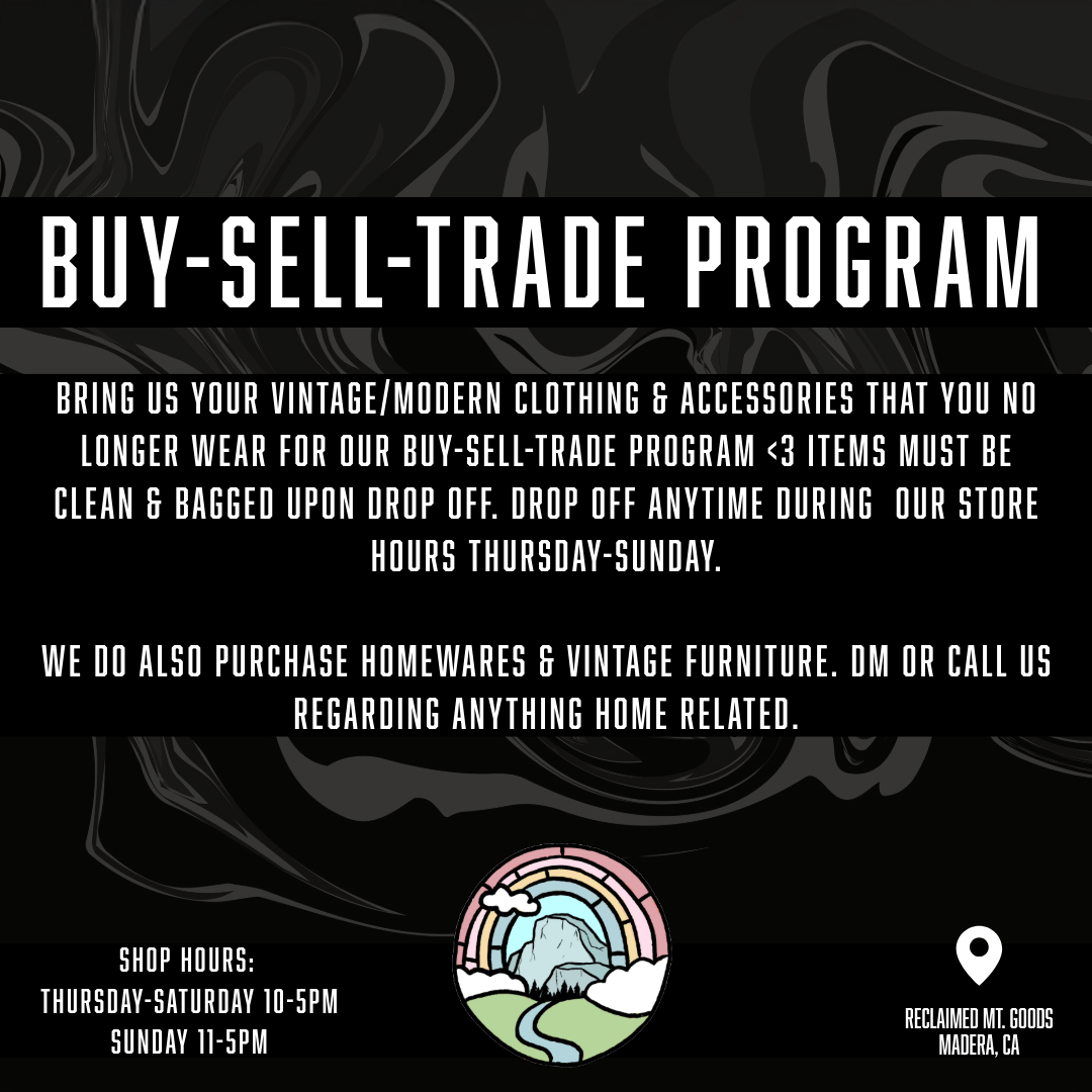 - Take advantage of our Buy-Sell-Trade program for clothing~ Bring your gently used clothing to us bagged, anytime during store hours for possible store credit