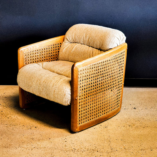 Vintage Caned Accented Oatmeal Fabric Armchair